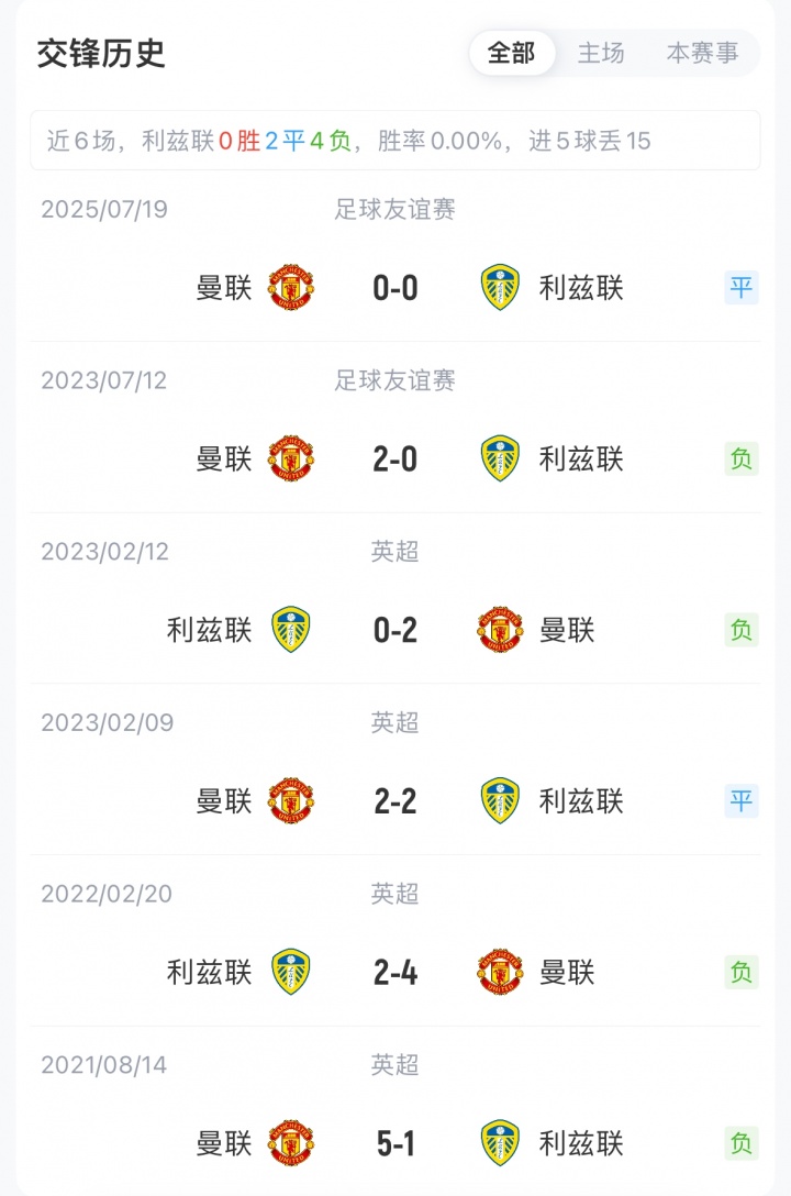 目前,曼联以8胜6平5负积30分排名英超第6位,近4轮仅取得1场胜利;利兹联以5胜6平8负积21分排名英超第16位。他们近6轮比赛2胜4平,保持不败。双方近6次交手,曼联4胜2平,保持不败。